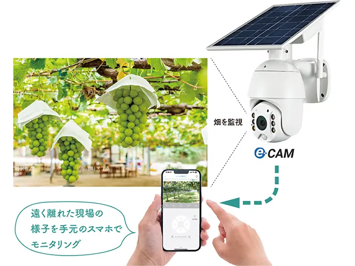 『e-CAM』は、動体検知によるアラーム・録画・スマホ通知、スマホからの遠隔アクセスや音声警告機能などを備え、ほ場や農機具・資材の盗難防止や省力化に貢献する製品として紹介されています。
